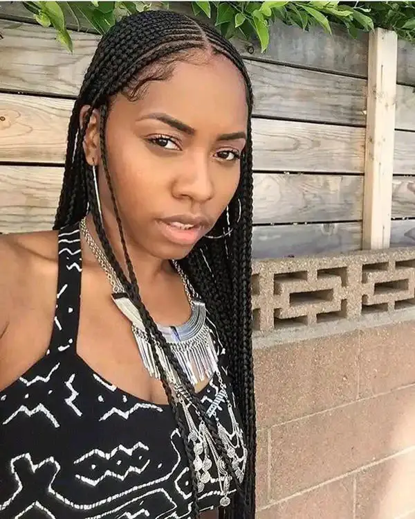 7. Fulani Braids with Side-Swept Bangs: Allow a few braids to fall loose, creating side-swept bangs that add softness to your style. A feminine touch that frames your face elegantly.