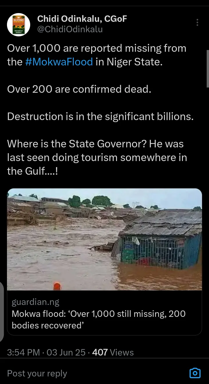 Reacting after the report surfaced online, Chidi Odinkalu empathized with the people of Niger state. He said the incident has led to the death of many people and the destruction of properties worth billions. Chidi Odinkalu said the governor of Niger state was last seen doing tourism.