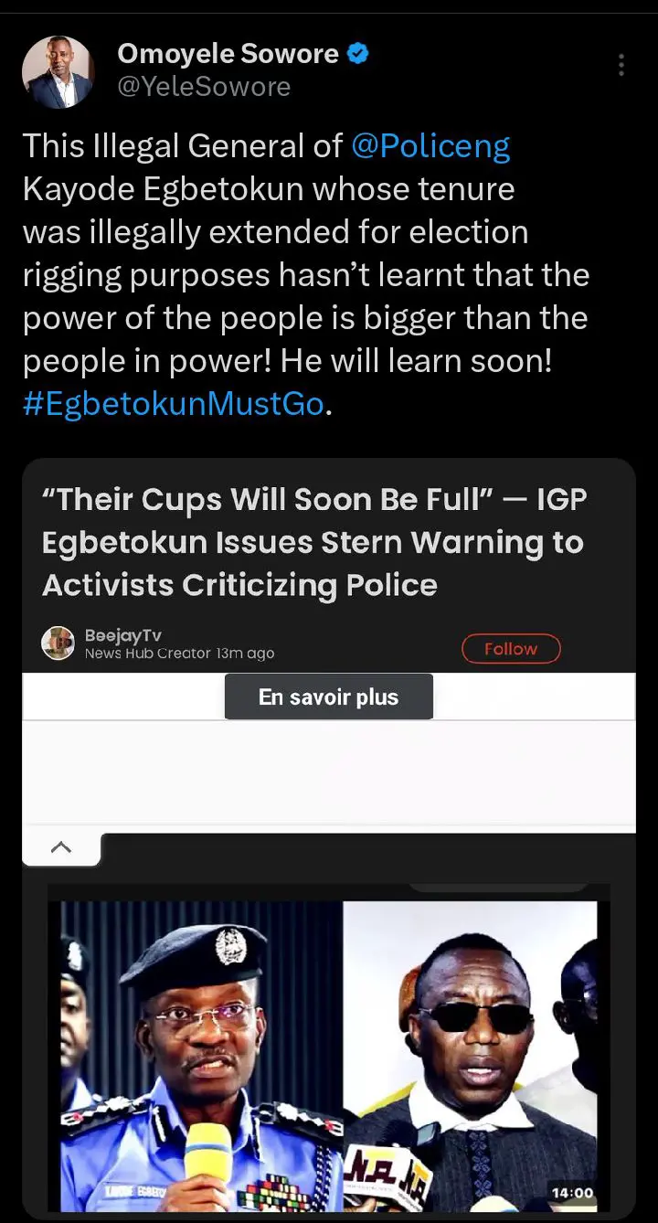 Sowore, the founder of Sahara Reporters, shared a post featuring an image of the IGPâs statement alongside his own commentary. In his response, Sowore labeled Egbetokun an âIllegal Generalâ and accused him of benefiting from a tenure extension aimed at influencing the 2027 elections. The activistâs post, which included the hashtag #EgbetokunMustGo, quickly gained traction, reflecting ongoing tensions between Nigerian authorities and civil society.