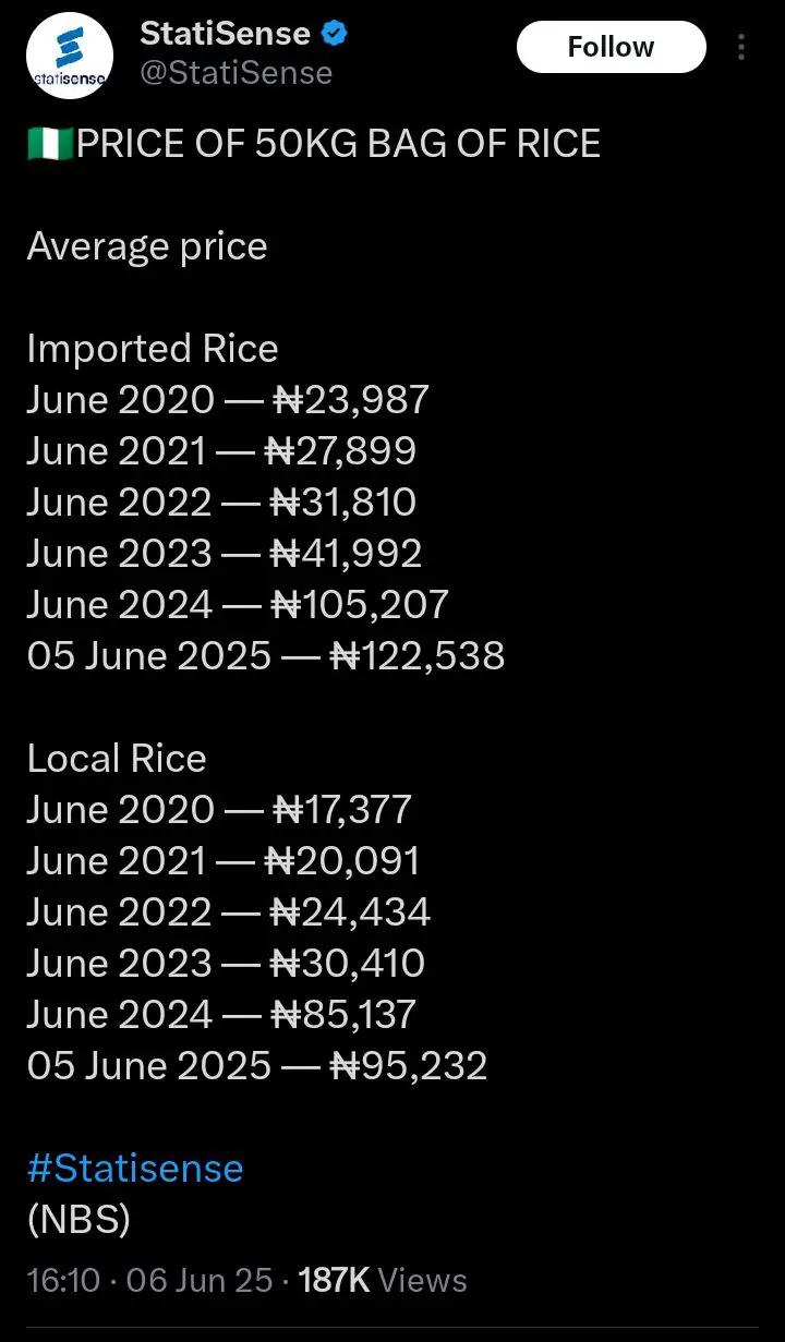 Dada Olusegun, a notable voice on X, recently shared his thoughts after reviewing data posted by @StatiSense, which tracks the average price of 50kg bags of rice from June 2020 to June 2025, sourced from the Nigeria Bureau of Statistics (NBS).