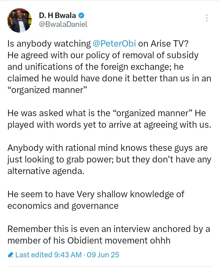 The presidency recently reacted after the former governor of Anambra State and Presidential aspirant of the Labour Party Peter Obi agreed with president Tinubu’s policy on removal of subsidy but made it known that he would have done it better. The message was delivered by the special adviser to the president on policy communications, Daniel Bwala on his official X handle.The special adviser to the president on policy communications, Daniel Bwala recently drew the attention of the general public to a recent interview on AriseTv where the former governor of Anambra State and Labour Party presidential aspirant, Peter Obi agreed with president Tinubu’s policy on removal of subsidy and unification of foreign exchange.