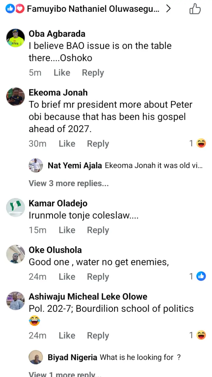 The Special Assistant on Media to Minister of the Federal Capital Territory and chieftain of the Peoples Democratic Party, Lere Olayinka stated on his verified Facebook page on Monday; âFormer Governor of Ekiti State, Ayodele Fayose, during his visit to President Bola Ahmed Tinubu, in Lagos today.â