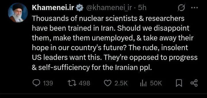 Iran’s Supreme Leader, Ayatollah Ali Khamenei, has reaffirmed his strong support for the country’s nuclear program and its community of scientists, while sharply criticizing the United States for what he described as efforts to undermine Iran’s scientific development and national independence.In a statement shared via his official Twitter account, Khamenei emphasized that thousands of Iranian nuclear experts have been trained over the years. He questioned whether these scientists should be cast aside, made unemployed, and stripped of their hope for the future just to satisfy the demands of “arrogant” U.S. officials, whom he accused of opposing Iran’s progress and self-sufficiency.