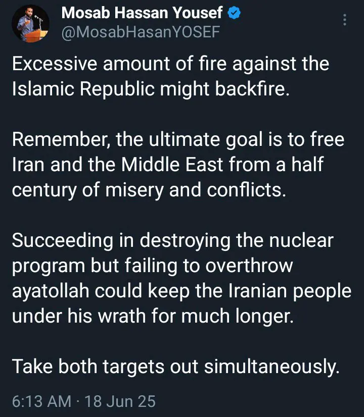 In a recent post on X (formerly Twitter), Yousef argued that any isolated military strike on Iran’s nuclear infrastructure could backfire—prolonging the suffering of the Iranian people if the Ayatollah’s regime remains in power.