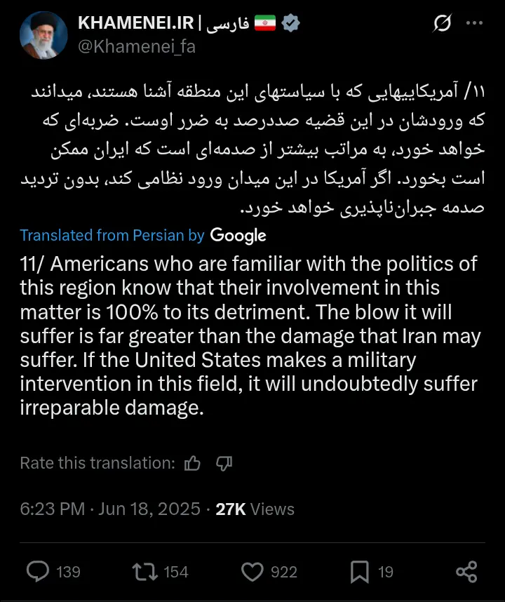 In a statement shared via his verified Twitter account, Khamenei declared: