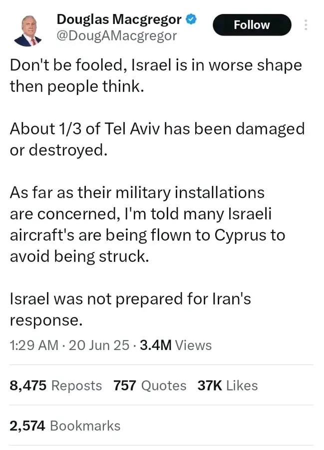 Israel In Worse Shape Than People Think – Douglas Macgregor Claims 1 in 3 of Tel Aviv Damaged
