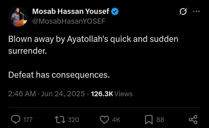 Still, Mosab Yousef’s tweet reflects a growing perception — especially in Western and opposition circles — that Iran’s military leverage may be diminishing after critical infrastructure damage and muted responses from some of its traditional regional allies.
