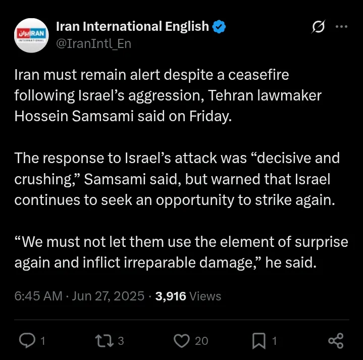 “We must not let them use the element of surprise again and inflict irreparable damage,” Samsami stated, underscoring the need for Iran’s military and intelligence units to remain fully alert. His comments come amid growing uncertainty surrounding the longevity of the ceasefire and Israel’s next moves.