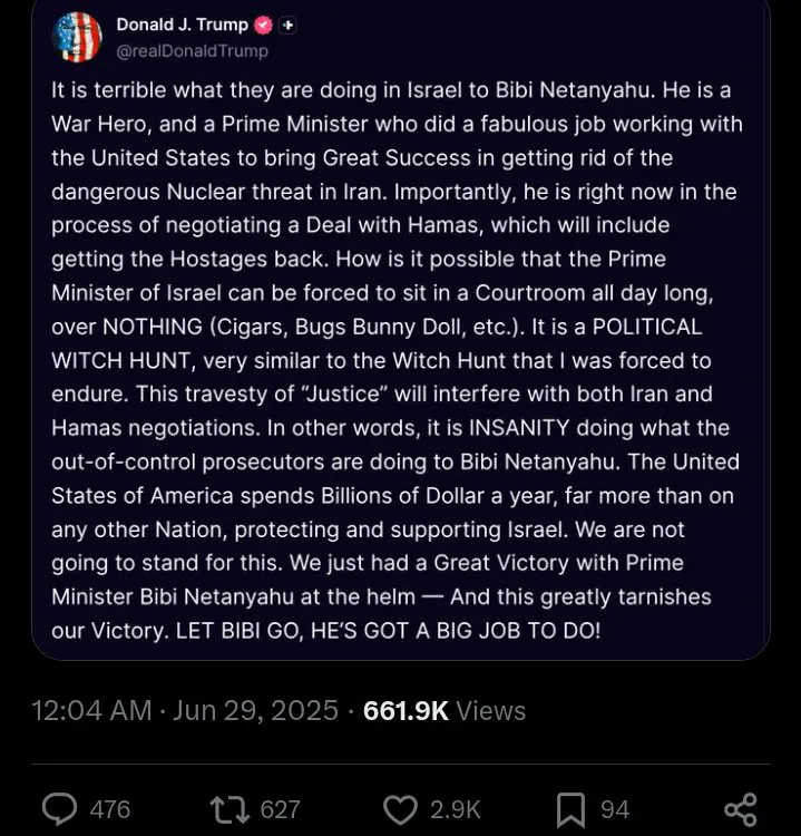 Framing his remarks as more than just personal opinion, Trump issued a direct call to drop the charges, insisting that Israel cannot afford to have its leader sidelined by what he sees as politically charged legal drama. “Israel needs its Prime Minister focused on national security—not tied up in court over nonsense,” he concluded.