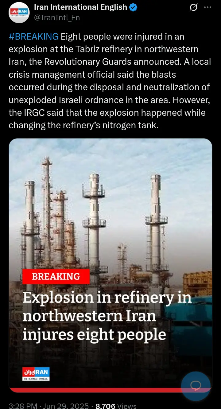 Large Explosion In Iran As Conflicting Reports Emerge After Explosion at Tabriz Refinery Injures 8