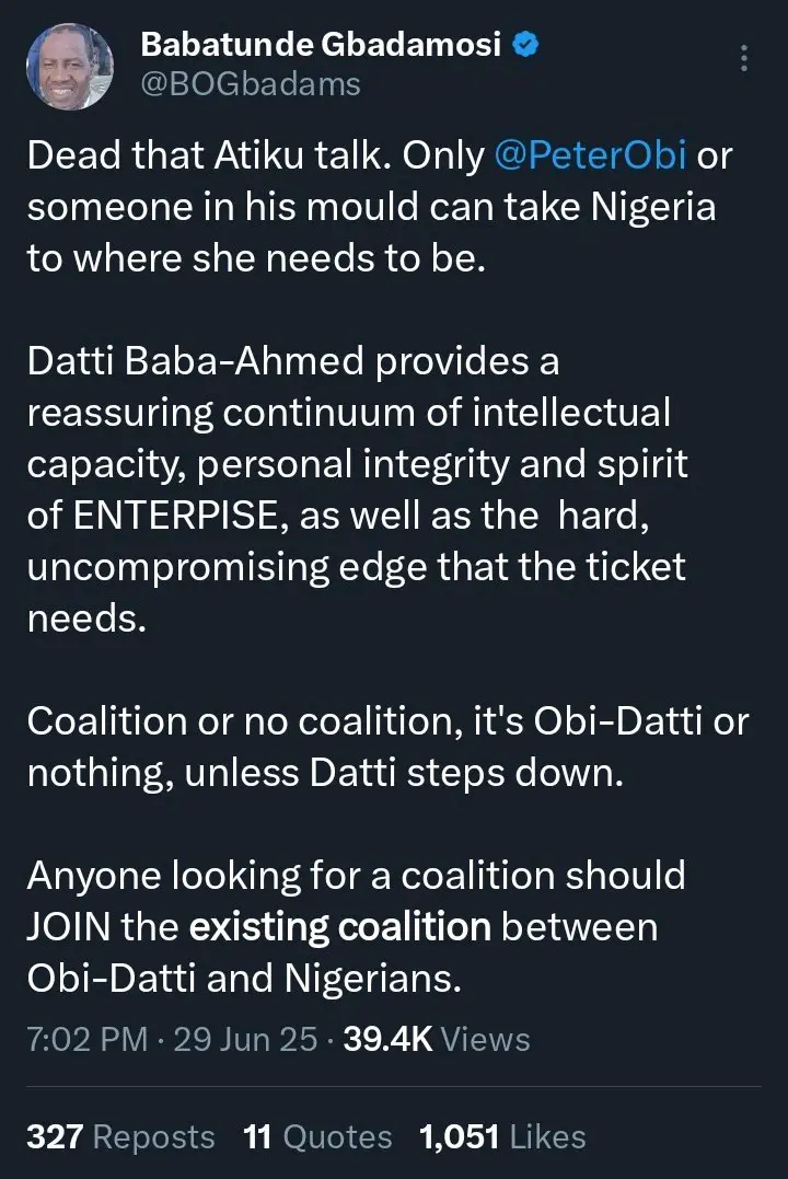 He further emphasized that the existing alliance between Obi, Datti, and ordinary Nigerians already forms a powerful political force. Rejecting any suggestion of an alternative coalition, Gbadamosi advised those seeking real change to align themselves with the momentum Obi and Datti have built. “Coalition or no coalition, it’s Obi-Datti or nothing—unless Datti decides to step aside,” he wrote, adding that the movement’s broad support makes it the most credible path for transforming Nigeria ahead of the 2027 elections.