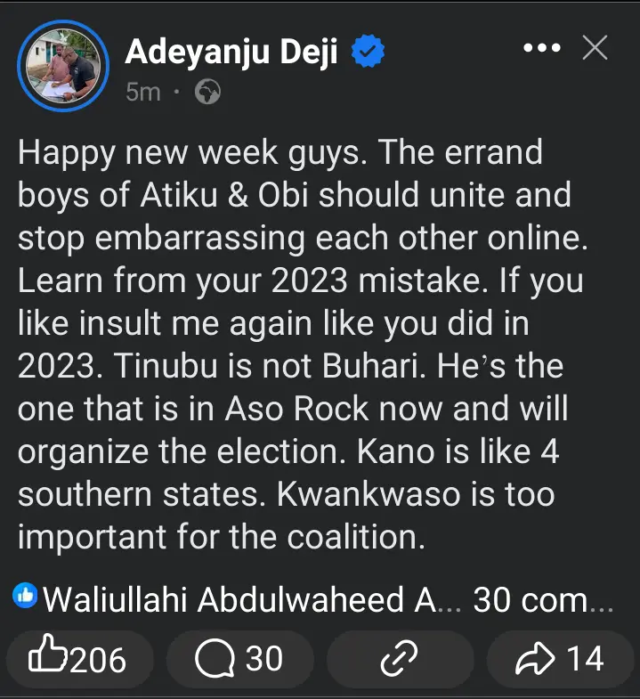 “Happy new week guys,” he tweeted. “The errand boys of Atiku & Obi should unite and stop embarrassing each other online. Learn from your 2023 mistake. If you like, insult me again like you did in 2023 — Tinubu is not Buhari. He’s the one that is in Aso Rock now and will organize the election.”