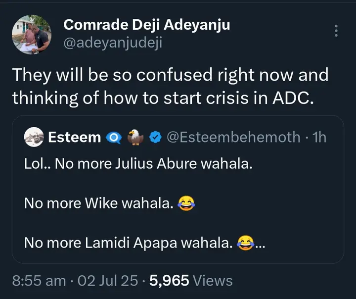 In a cryptic post on X (formerly Twitter), Adeyanju wrote: “They will be so confused right now and thinking of how to start crisis in ADC.”