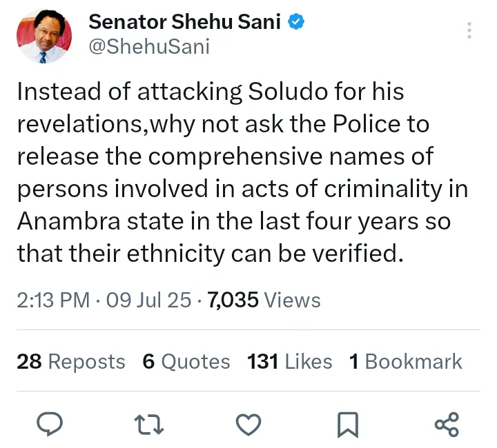 One of the chieftains of the All Progressive Congress, APC and former Kaduna lawmaker who represented Kaduna Central at the National Assembly, Senator Shehu Sani has reacted after the governor of Anambra state, Charles Soludo spoke about criminals terrorizing Anambra state.His statement was contained in a post that he shared on his official X handle on Wednesday, July 9, 2025.