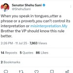 However, Senator Shehu Sani has now shared his thoughts after the report surfaced online. In a post that he shared on his official X handle, he said when people utter a proverb or phrase, they can’t control the meaning.