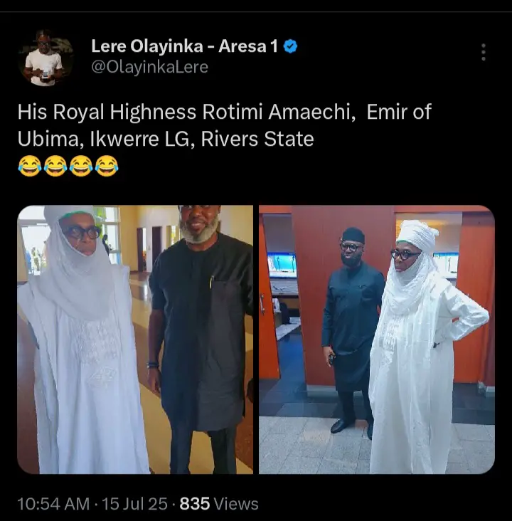 Lere Olayinka, the special adviser to the former governor of Rivers State and FCT minister, Nyesom Wike recently reacted after former transportation minister and ADC coalition Chieftain, Rotimi Amaechi was captured in an Emir traditional attire. According to the statements which were shared on his official X handle, he described the former governor as ‘His Royal Highness’.Former Rivers State governor and one of the leading founders of the ADC coalition, Rotimi Amaechi has drawn public attention after he was captured in an an Emirate traditional attire on Tuesday.