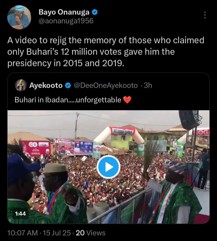 In his statements, Bayo Onanuga pointed out that the video was to rejig the memory of those who claimed that only the former president’s 12 million votes won him the presidency in 2015 and 2019.