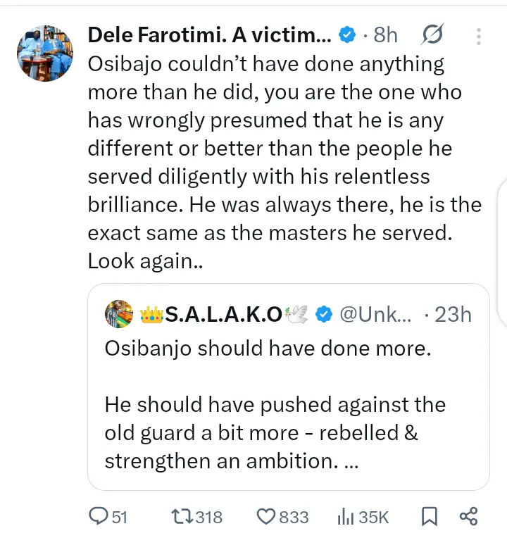 He wrote: “Osibajo couldn’t have done anything more than he did, you are the one who has wrongly presumed that he is any different or better than the people he served diligently with his relentless brilliance. He was always there, he is the exact same as the masters he served. Look again.”