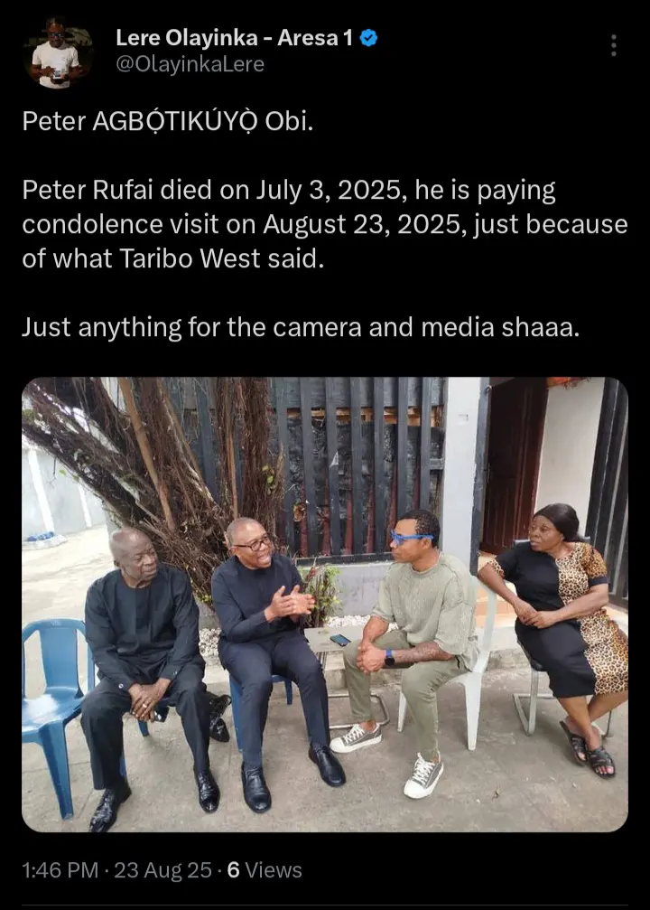 Lere Olayinka Blasts Peter Obi Over ‘Hypocritical’ Condolence Visit to Peter Rufai’s Family