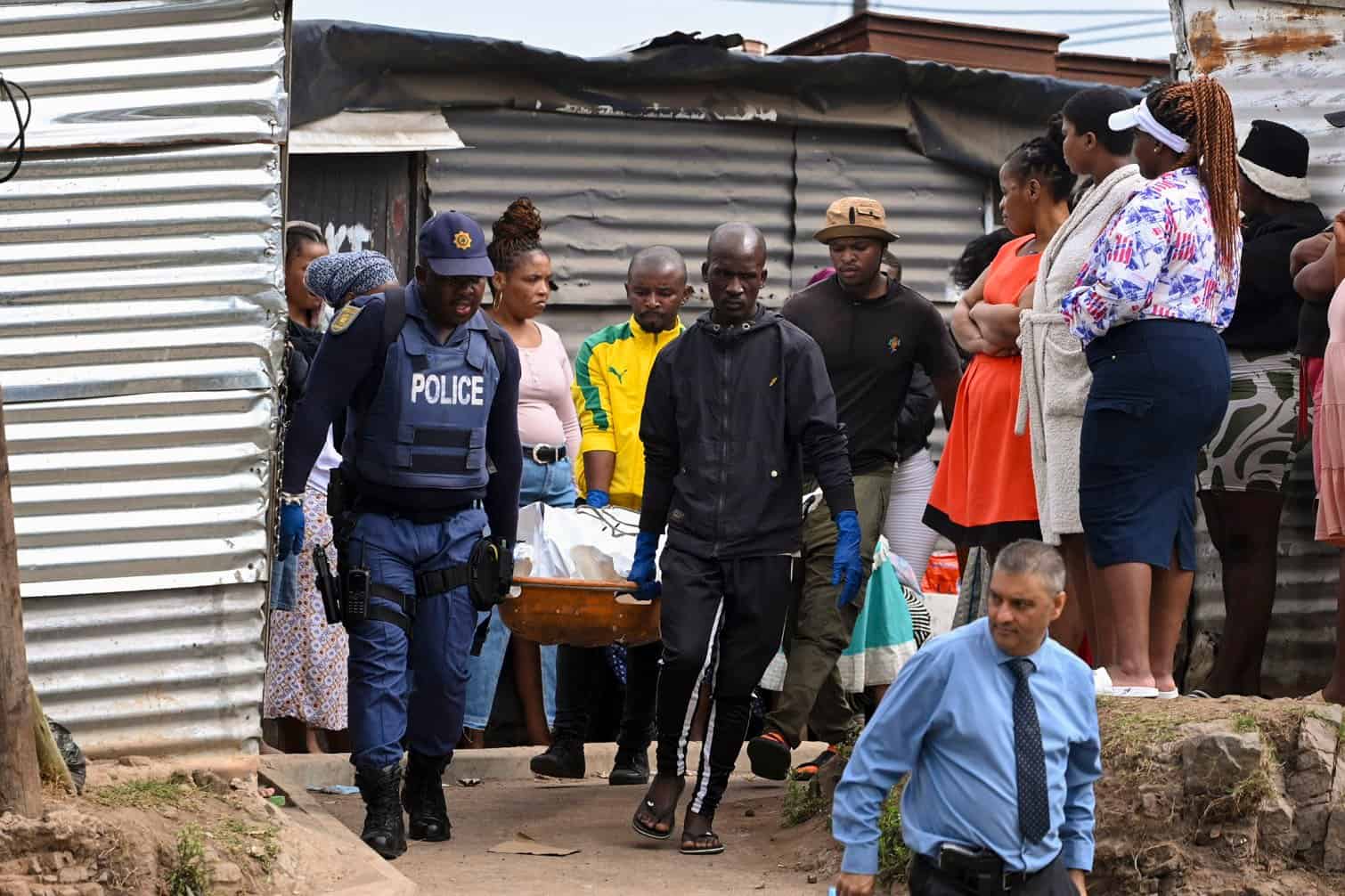 A deceased suspect is carried to the MLM mortuary van in Chatsworth on September 08, 2025 in Durban, South Africa. It is reported that the deceased suspects were linked to incidents of murder, attempted murder, stock theft and extortion. (Photo by Gallo Images/Darren Stewart)