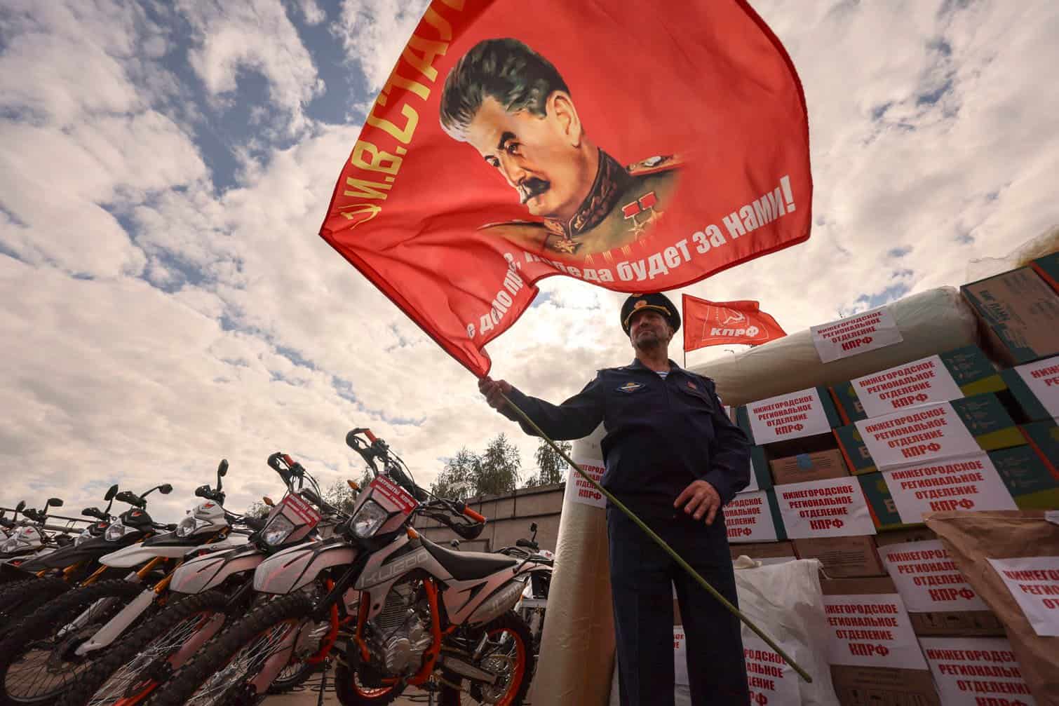 A Russian serviceman holds a red flag with a portrait of Soviet leader Josef Stalin during the send-off of the 143rd humanitarian convoy organized by the Russian Communist Party for the Russian army and residents of the Kursk, Donetsk and Luhansk regions, at the Lenin State Farm outside Moscow, Russia, 08 September 2025. The convoy is dedicated to the 80th anniversary of the Red Army’s victory over Japan and the end of World War II in 1945. It contains food, medicine, drones and hundreds of motocross motorcycles, which are used by the military on the front line for assault operations. Picture: EPA/SERGEI ILNITSKY