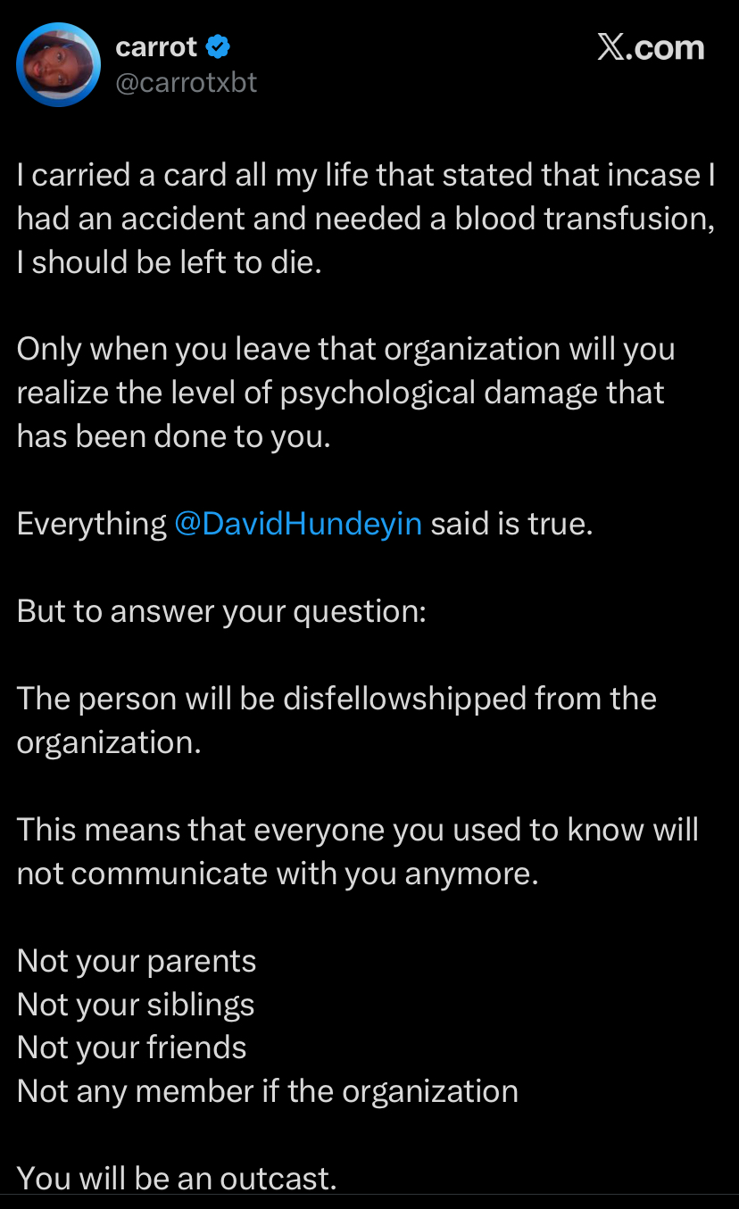 The lady, identified on X (formerly Twitter) as @carrotxbt, shared that during her time in the faith, she carried a card stating that in the event of an accident requiring a blood transfusion, she should be left to die.