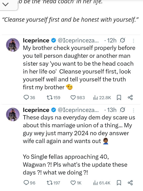 These experiences, Ice Prince explained, reflect a larger pattern of unresolved personal issues, emotional baggage, and lack of preparedness among couples. He stressed that before involving someone’s daughter or sister in marriage, men must first evaluate themselves, work on personal growth, and achieve emotional stability.
