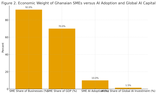 Research makes clear how central SMEs are to Ghana’s economic structure. They represent roughly 92 percent of registered businesses, contribute about 70 percent of GDP, and sustain the majority of employment. Yet, by 2023, fewer than one in ten had integrated any form of AI into their operations.