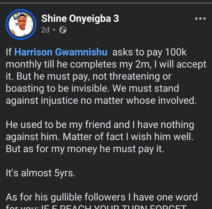 According to the man identified with the Facebook handle, Shine Onyebiga, Harrison Gwamnishu owed him 2 million naira, which remains unpaid after nearly five years.
