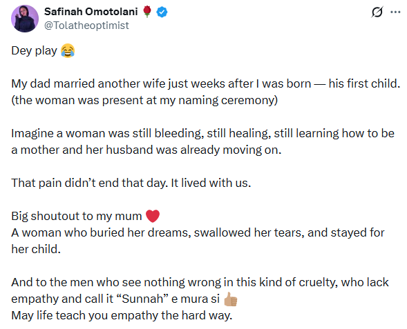“That pain didn’t end that day. It lived with us. Big shoutout to my mum. A woman who buried her dreams, swallowed her tears, and stayed for her child. And to the men who see nothing wrong in this kind of cruelty, who lack empathy and call it “Sunnah” e mura si. May life teach you empathy the hard way.”
