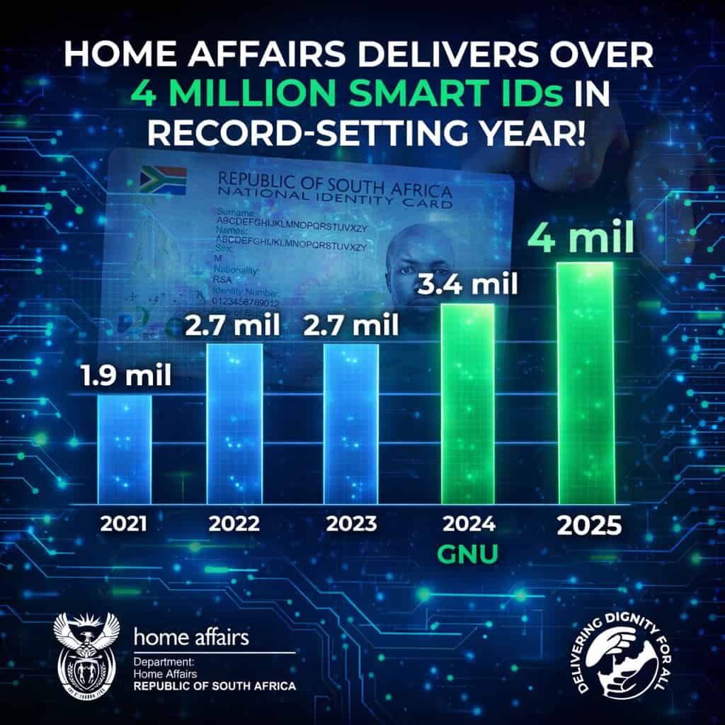 “This milestone represents a 17% increase on the 3 427 468 smart IDs issued during 2024, which was itself a new record at the time. The 2025 performance is about 1.3 million more than the number of smart IDs issued during the 2023 and 2022 calendar years.”
