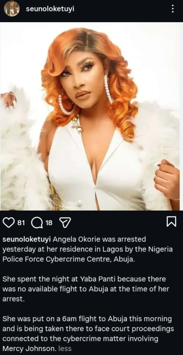 Seun Oloketuyi stated: “Angela Okorie was arrested yesterday at her residence in Lagos by the Nigeria Police Force Cybercrime Centre, Abuja. She spent the night at Yaba Panti because there was no available flight to Abuja at the time of her arrest. She was put on a 6am flight to Abuja this morning and is being taken there to face court proceedings connected to the cybercrime matter involving Mercy Johnson”.