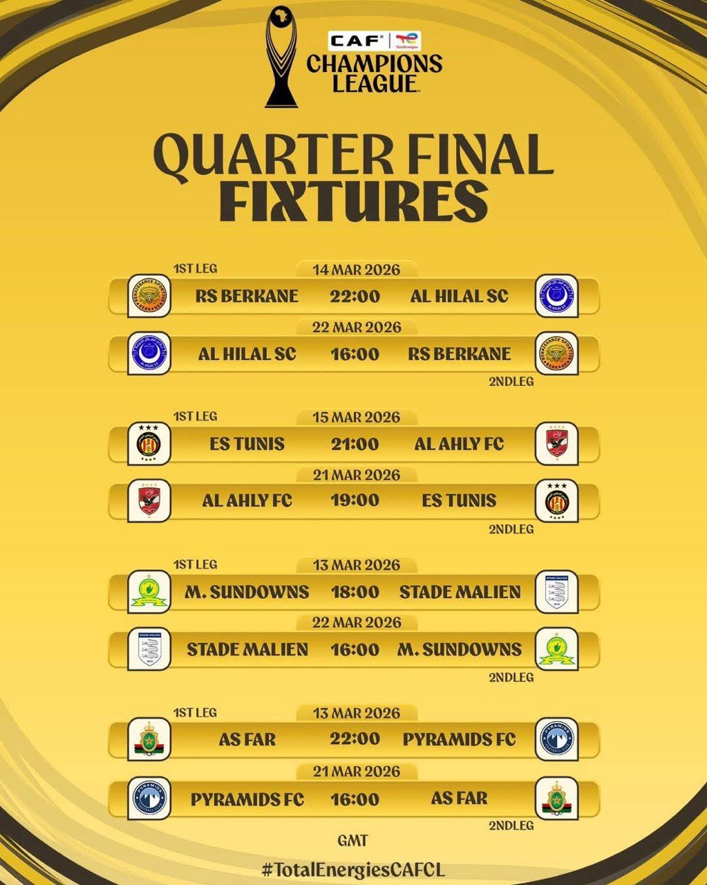 The stage is set for another thrilling chapter of African club football as the quarter-final fixtures of the CAF Champions League have been officially announced. The continent’s elite clubs will battle it out in March 2026 as they chase a place in the semi-finals of Africa’s most prestigious club competition.