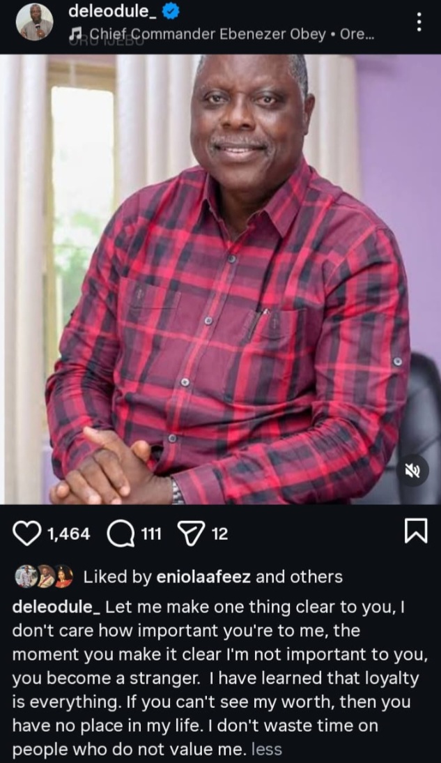 Veteran Nollywood actor Dele Odule is sending a strong message about loyalty, respect, and self-worth. Known for his roles in Yoruba films, Odule has always been admired for his authenticity both on and off the screen. Recently, he took to Instagram to share a personal reflection that has since resonated widely with fans and followers.