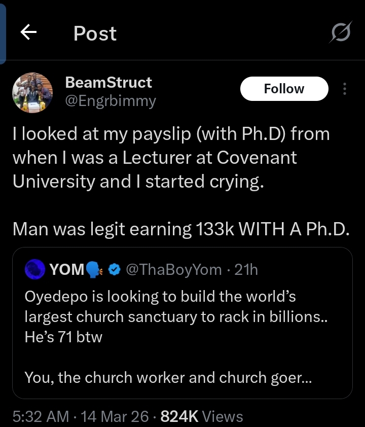 ”I looked at my payslip (with Ph.D) from when I was a Lecturer at Covenant University and I started crying.Man was legit earning 133k WITH A Ph.D”, The tweet reads.