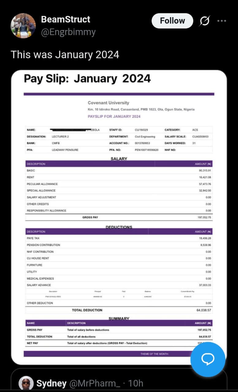 A former lecturer at Covenant University has gone viral online after sharing details of his monthly earnings.