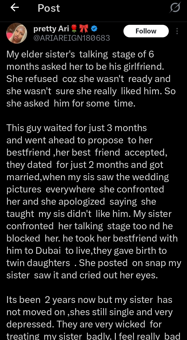 ‎‎‎A lady’s post about why her elder sister confronted a friend after accepting  proposal from her talking stage has left netizens in awe.