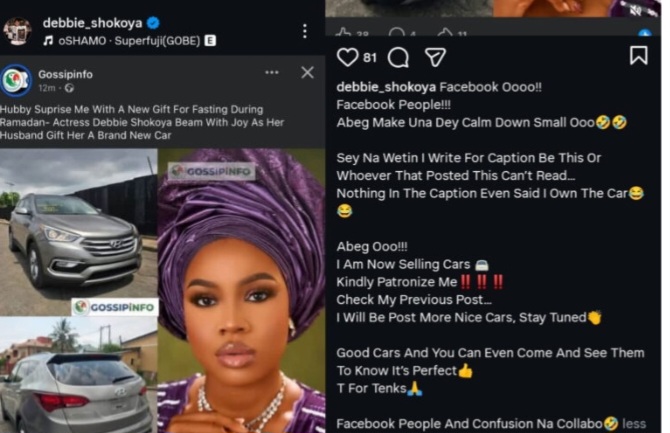 However, the actress quickly stepped forward to correct the narrative and clarify the situation. According to Shokoya, the car featured in her post does not belong to her and was never presented as a personal gift. Instead, she explained that the post was meant to promote her new venture into selling automobiles.