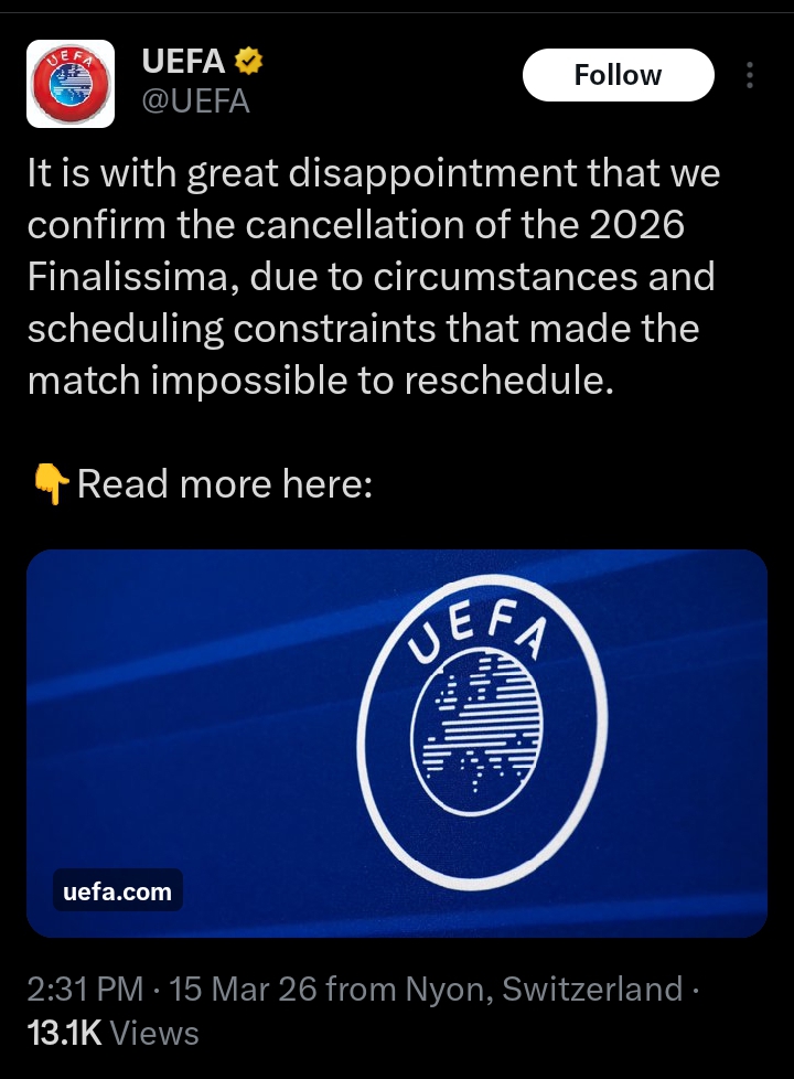 UEFA has confirmed that the 2026 Finalissima between Spain national football team and Argentina will no longer take place as originally planned.
