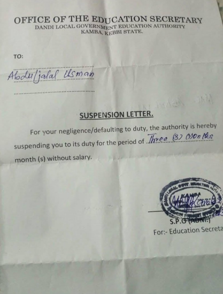 “A classroom teacher in Kebbi, Abduljalal Usman has been suspended for 3 months without salary simply for rejecting one mudu of maize and one mudu of millet offered as Ramadan palliative from the government and for speaking out against the bad governance.