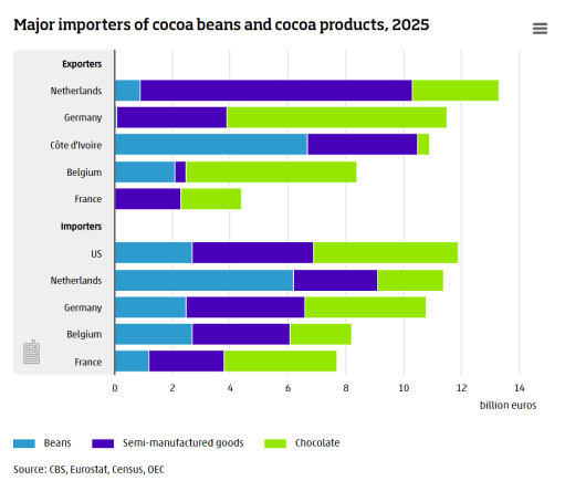 Beyond exports, the Netherlands also ranks among the world’s largest importers of cocoa beans, reinforcing its dual role as both a gateway and processing centre for the global cocoa industry. The country’s total cocoa trade including imports and exports places it ahead of traditional competitors such as Germany and Belgium.