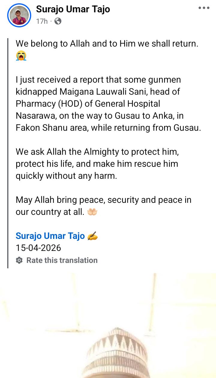 Sani was abducted while travelling along the Gusau–Anka Road in Zamfara State on Wednesday, April 15, 2026.