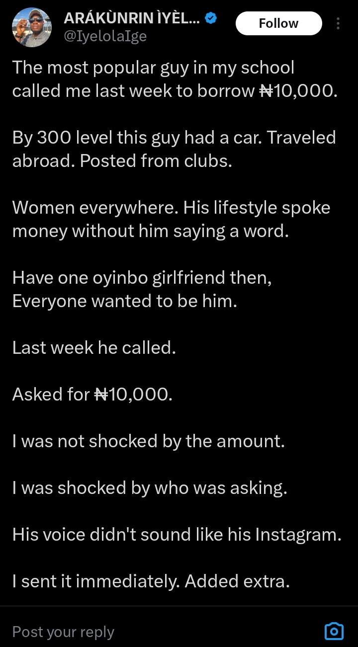 According to the X user, the request left him surprised, recalling that while in 300 level, the colleague had travelled abroad and was an extremely well-known student on campus.