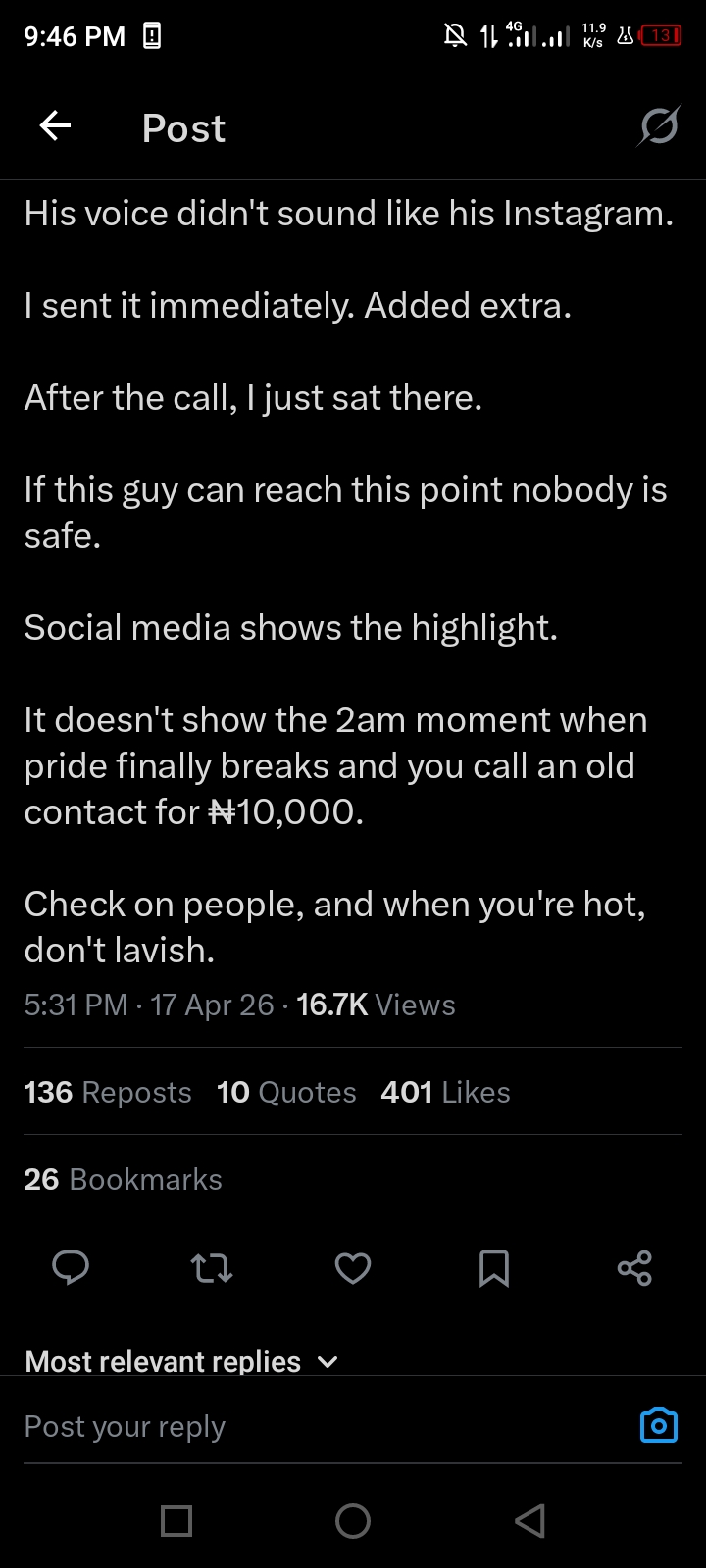 ”I was not shocked by the amount. I was shocked by who was asking. His voice didn’t sound like his Instagram. I sent it immediately. Added extra. After the call, I just sat”, He added.