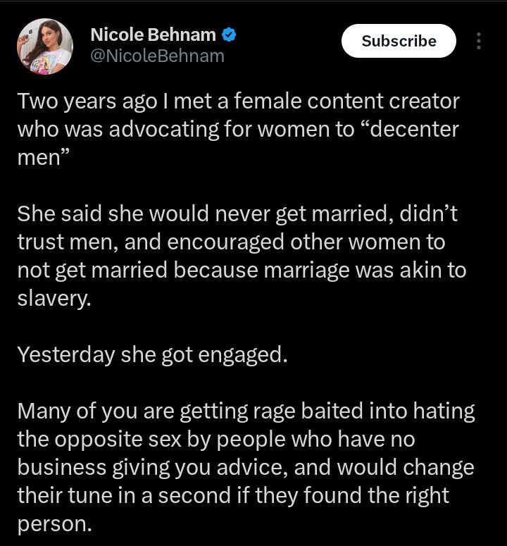 “Two years ago I met a female content creator who was advocating for women to ‘decenter men’. She said she would never get married, didn’t trust men, and encouraged other women not to marry because marriage was like slavery. Yesterday she got engaged,” she said.
